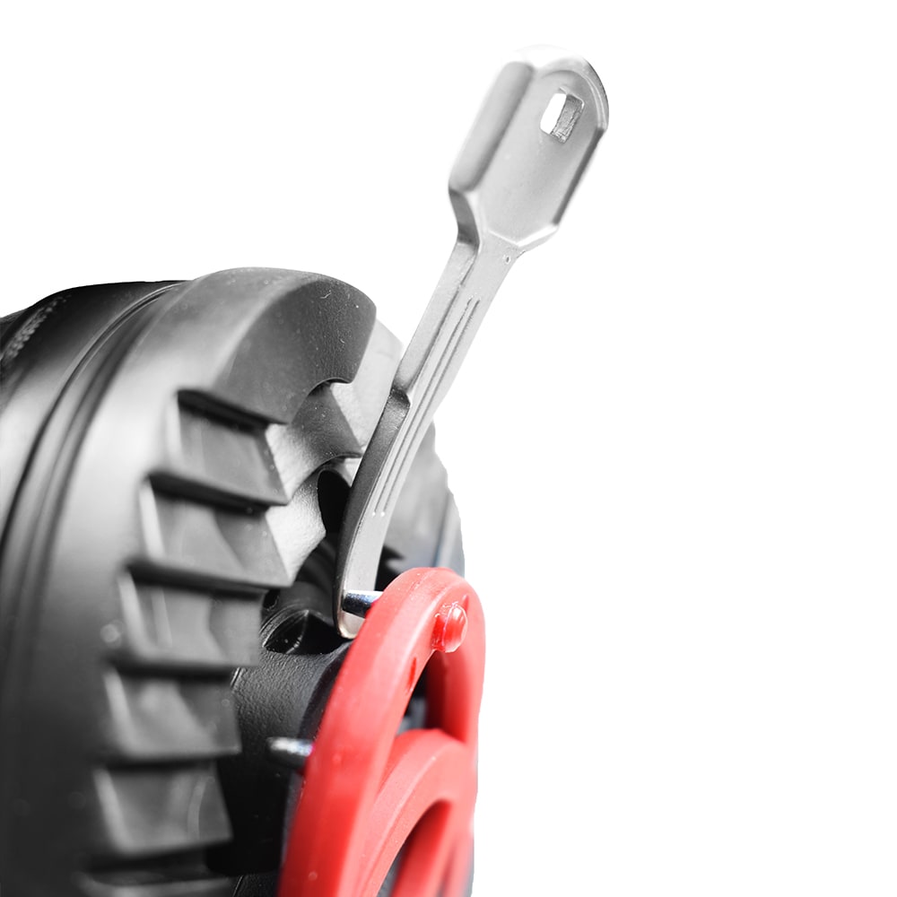 - Vi rekommenderar att du använder den medföljande nyckeln för att fälla broddarna fram och tillbaka och även för att hålla rent i spåren där fästena sitter.