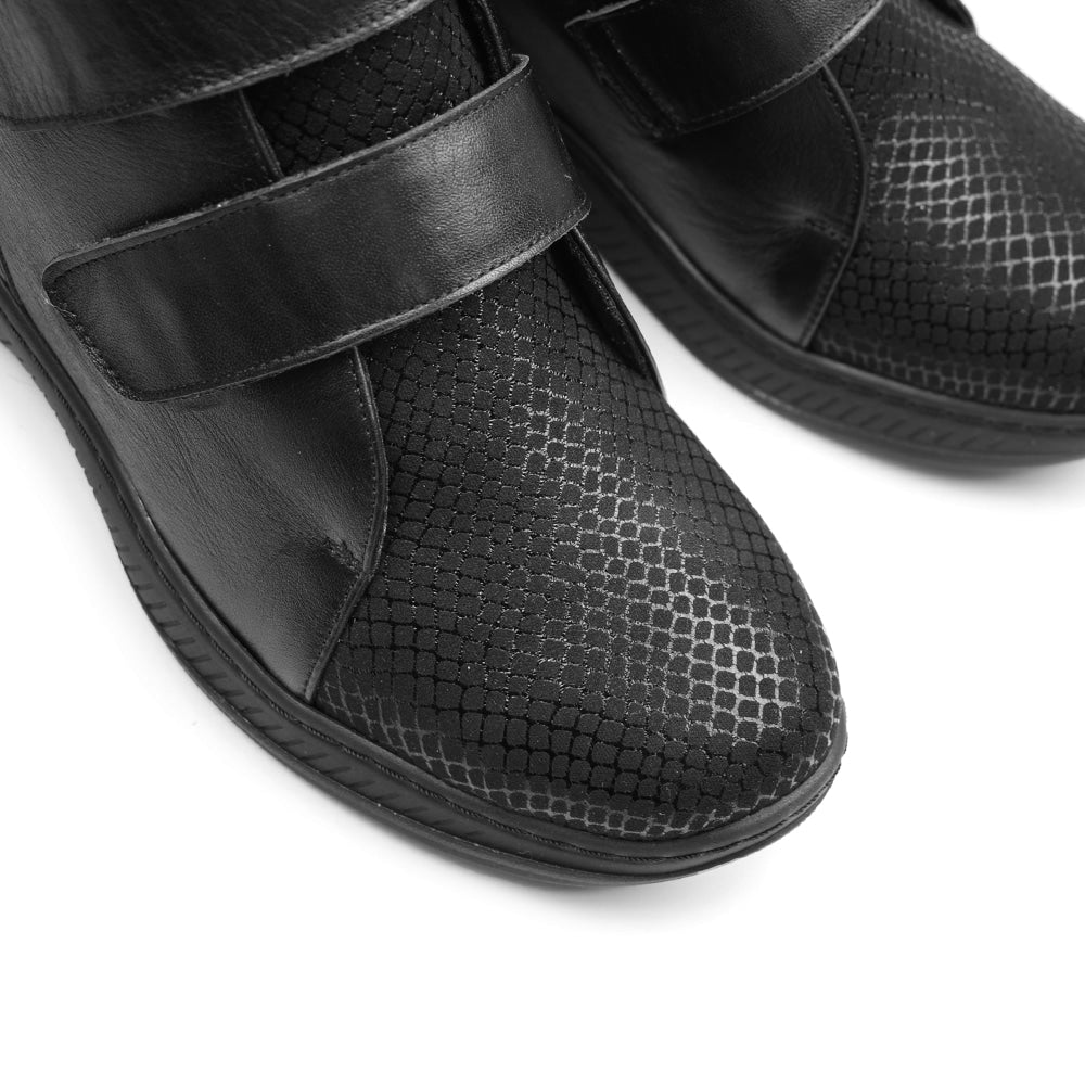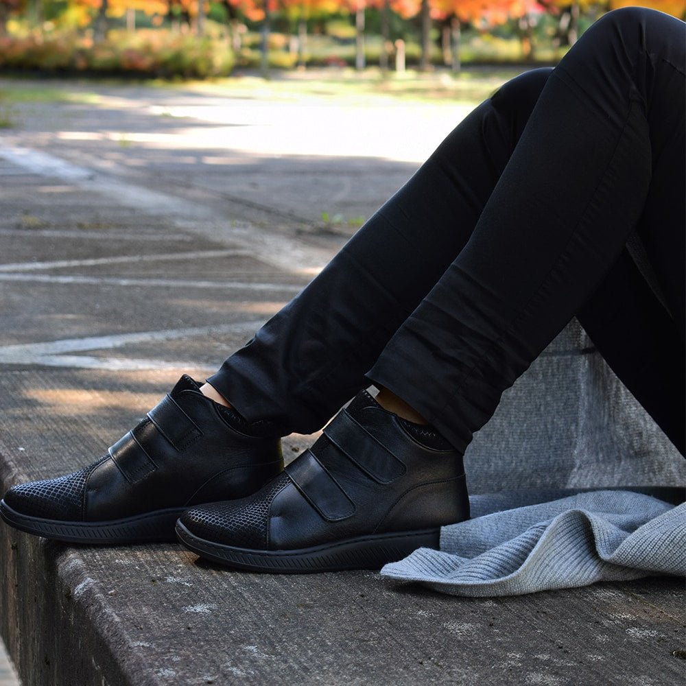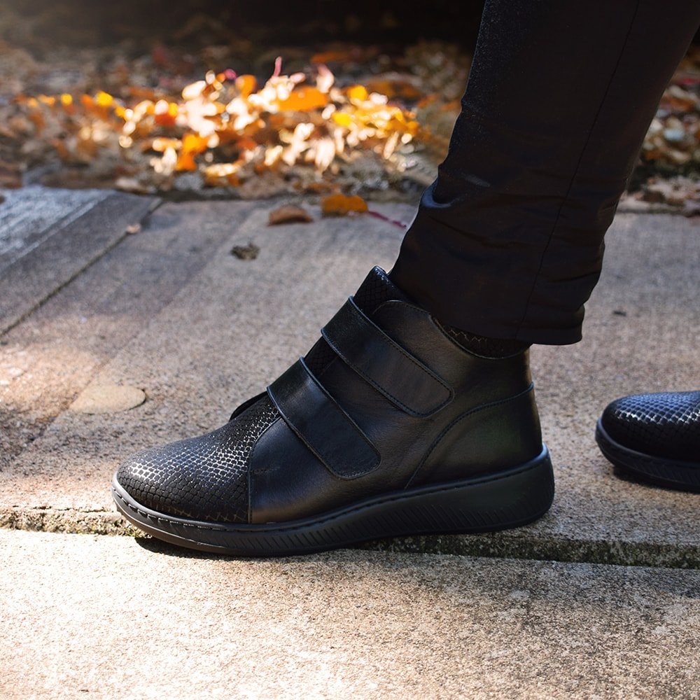 Rymliga och bekväma kängor för hösten med ett kort skaft och ovandel i stretch och nappaläder. Med sin vida öppning är dessa specialskor med kort skaft mycket lätta att komma i. Man öppnar och stänger skorna med kardborreremmar, så man slipper att krångla med snören.