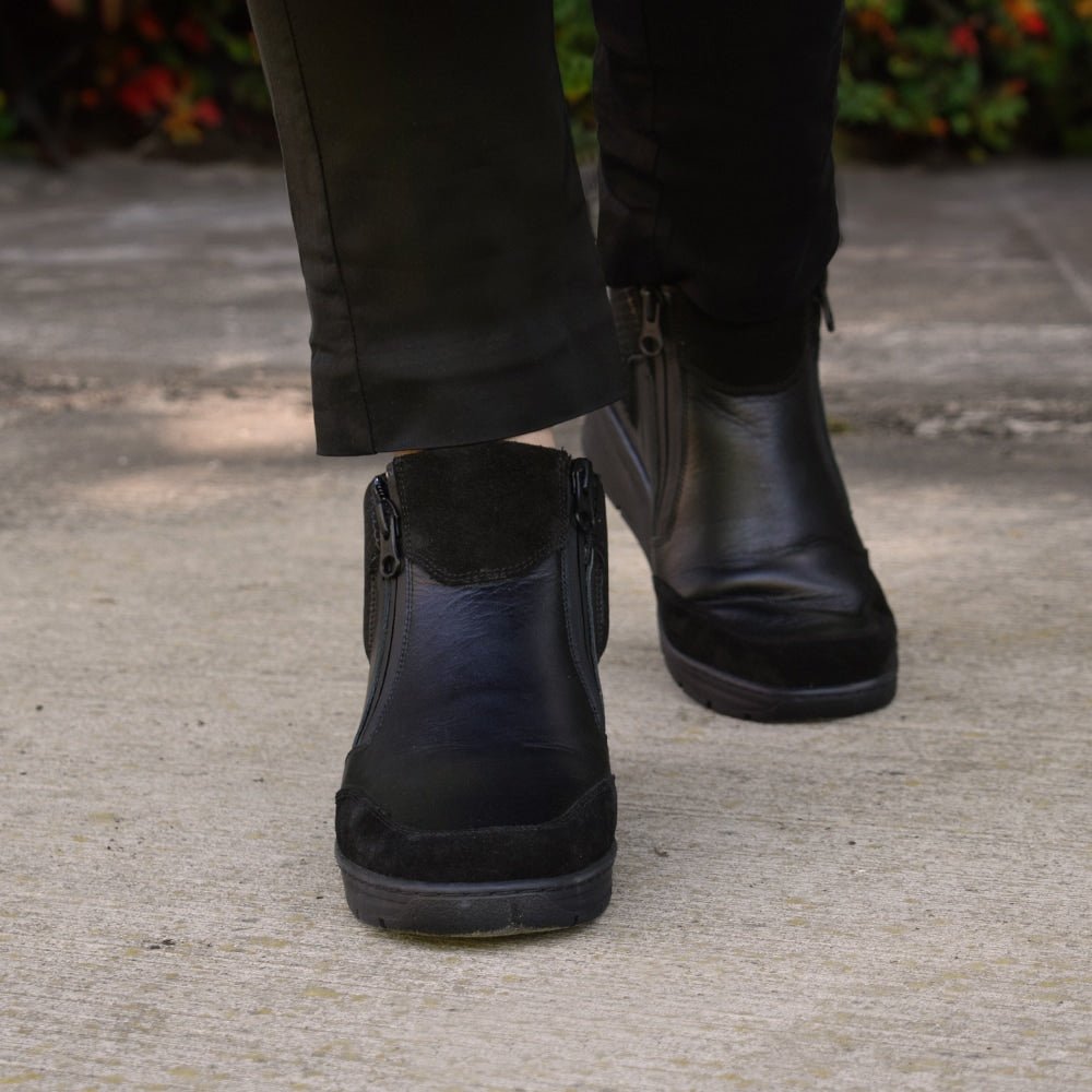Svarta boots i läder med dubbla dragkedjor och vattenavvisande membran som står emot väta. Praktiska och bekväma höstskor för dam med ett kortare skaft med mjuk komfort och flexibilitet runt ankeln. Skorna har rymlig passform med ovandel i mjuk nappaläder med detaljer i mocka. Tåboxen har en lite fyrkantig form där tårna får gott om plats.