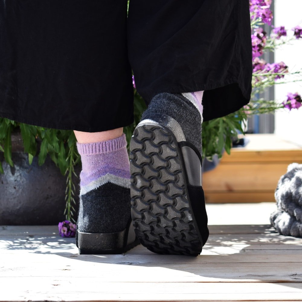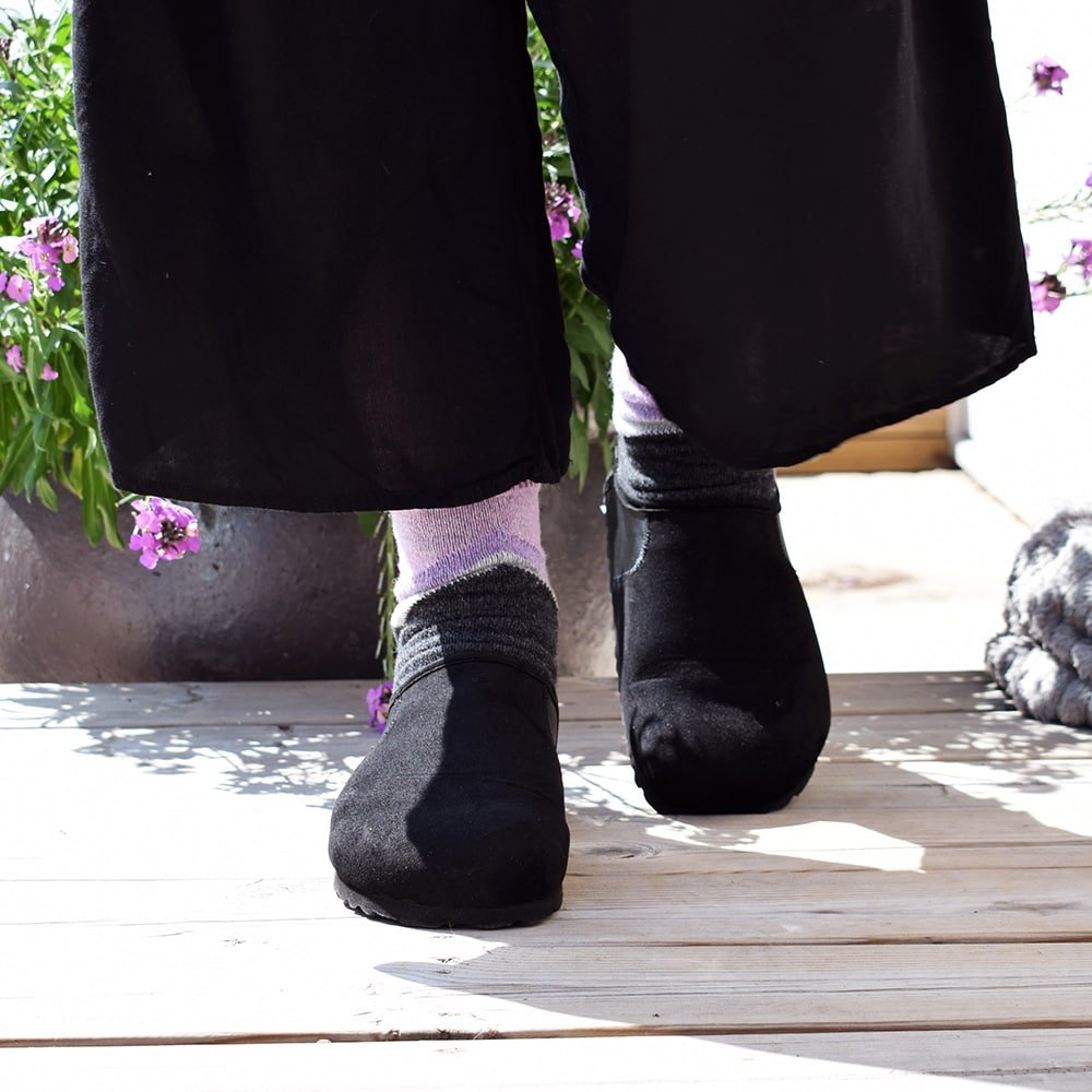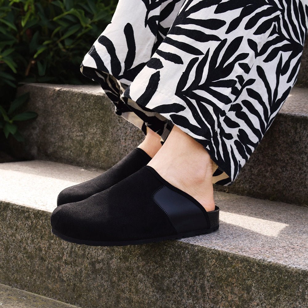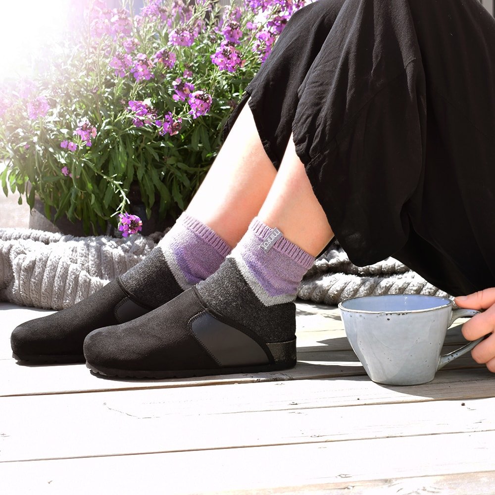 Flexibla och bekväma tofflor med överdel av mjukt mockaliknande textil med stretch med lycrafoder som passar knöliga, känsliga och ömma fötter eftersom de är följsamma och sitter bra på foten utan att klämma åt. Fotbädden i kork är klädd med mocka och ger mjukt stöd åt hela foten och har ett lätt hålfotsstöd.