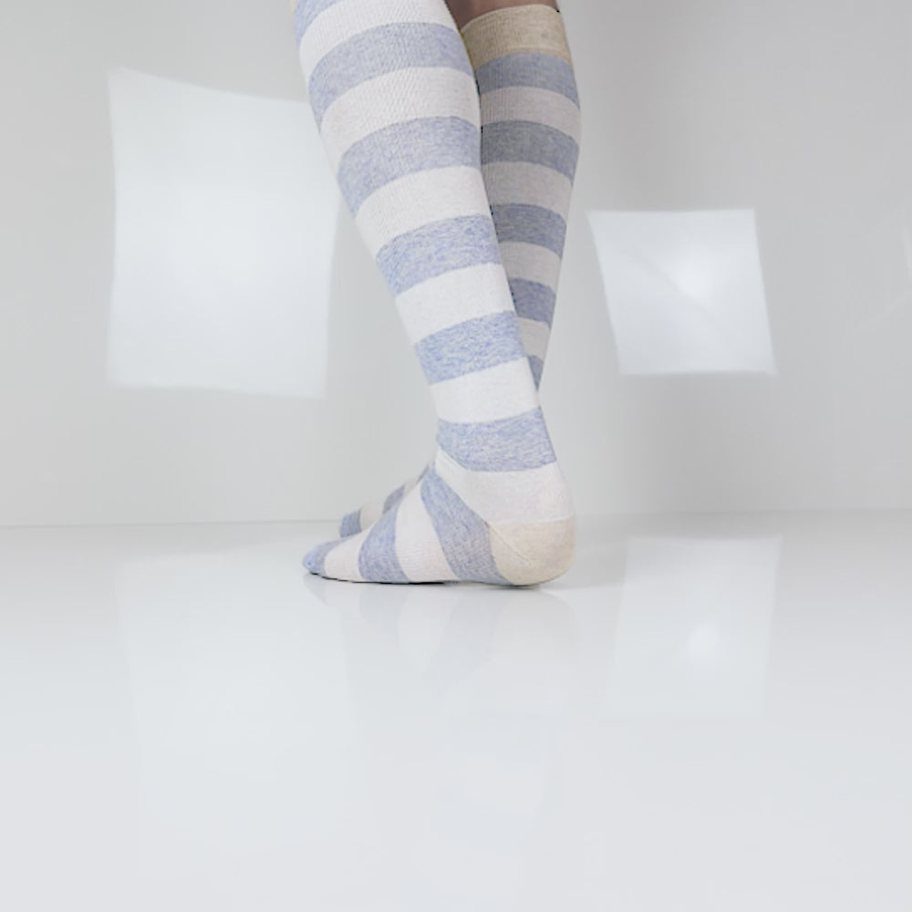 Stödstrumpornas mångsidiga design passar perfekt för olika tillfällen, vare sig det är för arbete, vardag eller mer formella sammanhang, med ränder inspirerade av svenska stränder, i en harmonisk kombination av beige, ljusblått och ljusgrått.
