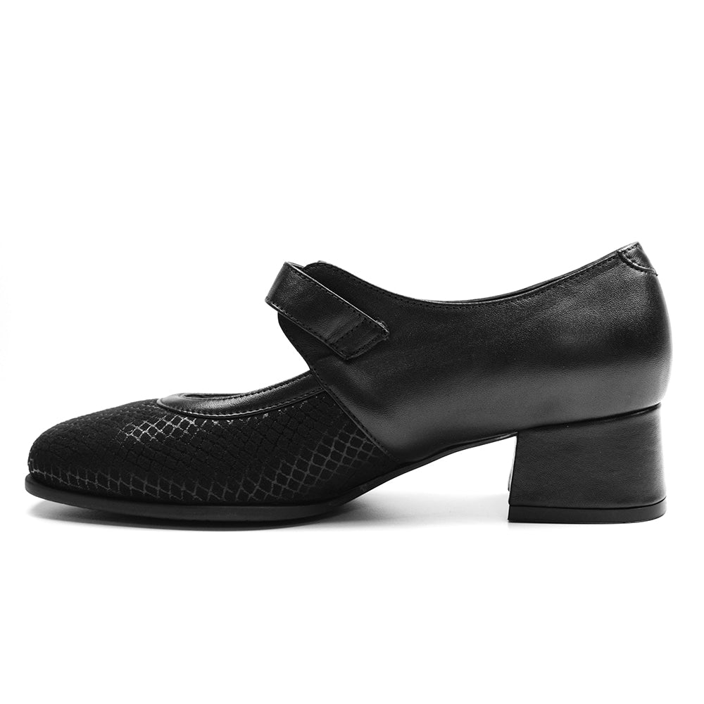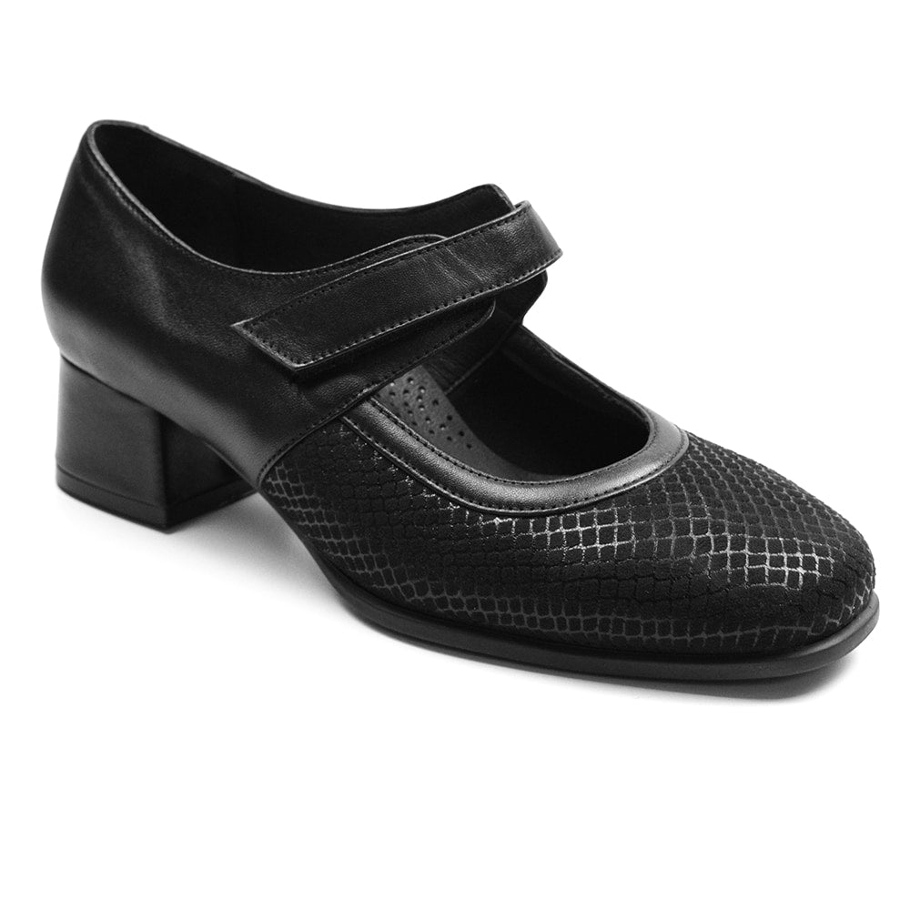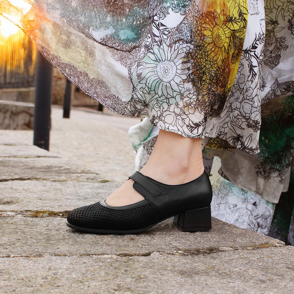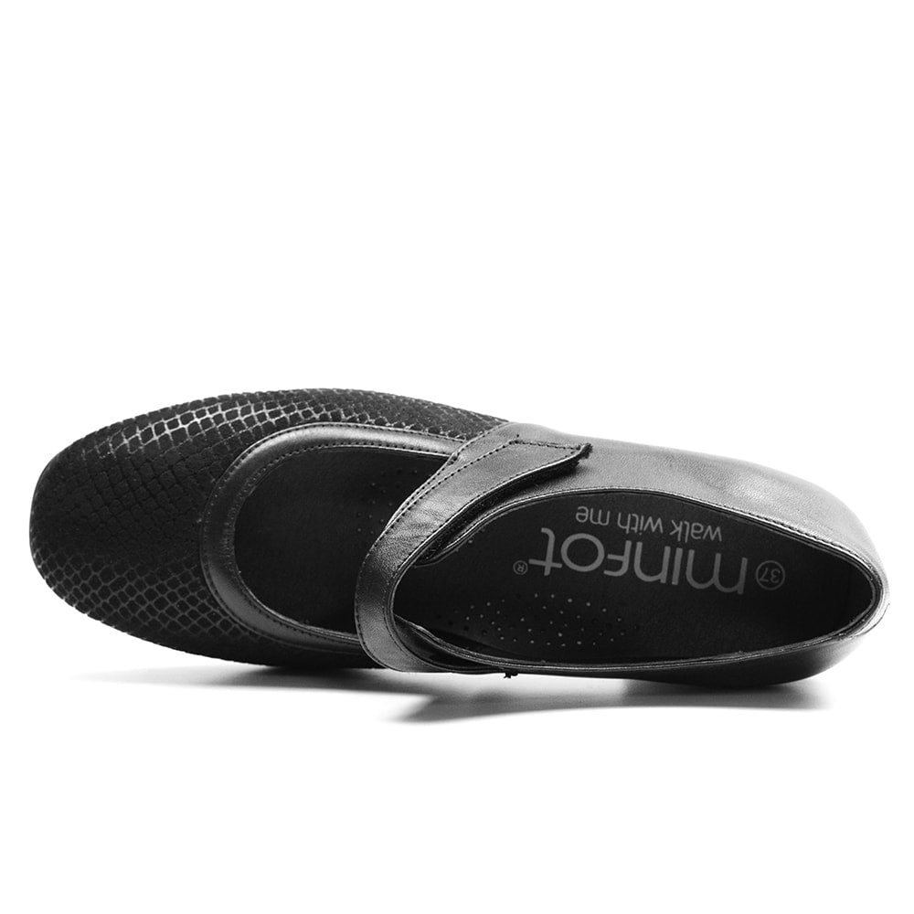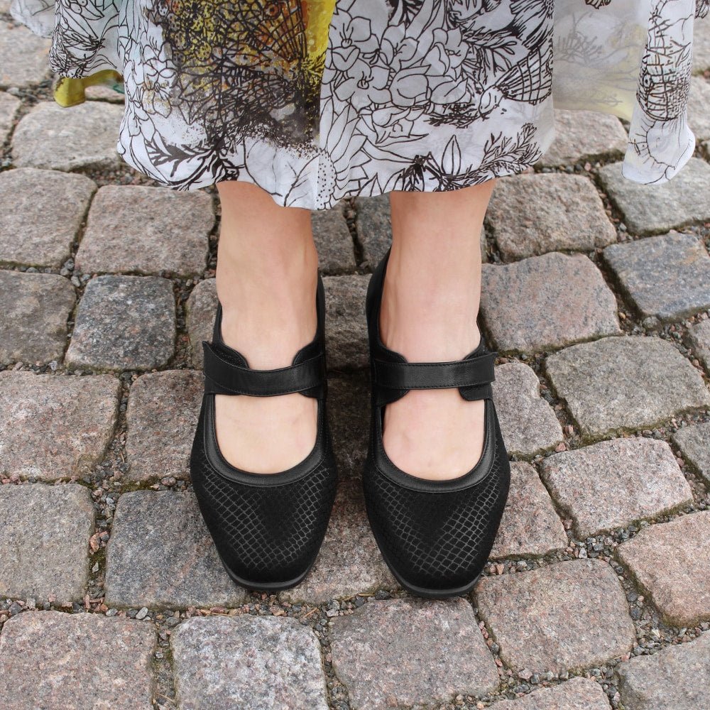 Damskor Minfot Stina har klack och bekväm passform där materialet formar sig efter foten. Skinn i hälkappan och sleif över vristen som går att justera med kardborre för bästa passform. Den främre delen av skon har ett elastiskt textilt material som ger fin komfort i dessa finskor. Passar även om man har ömmande hallux valgus då den stretchiga ovandelen är töjbar på det utsatta området.