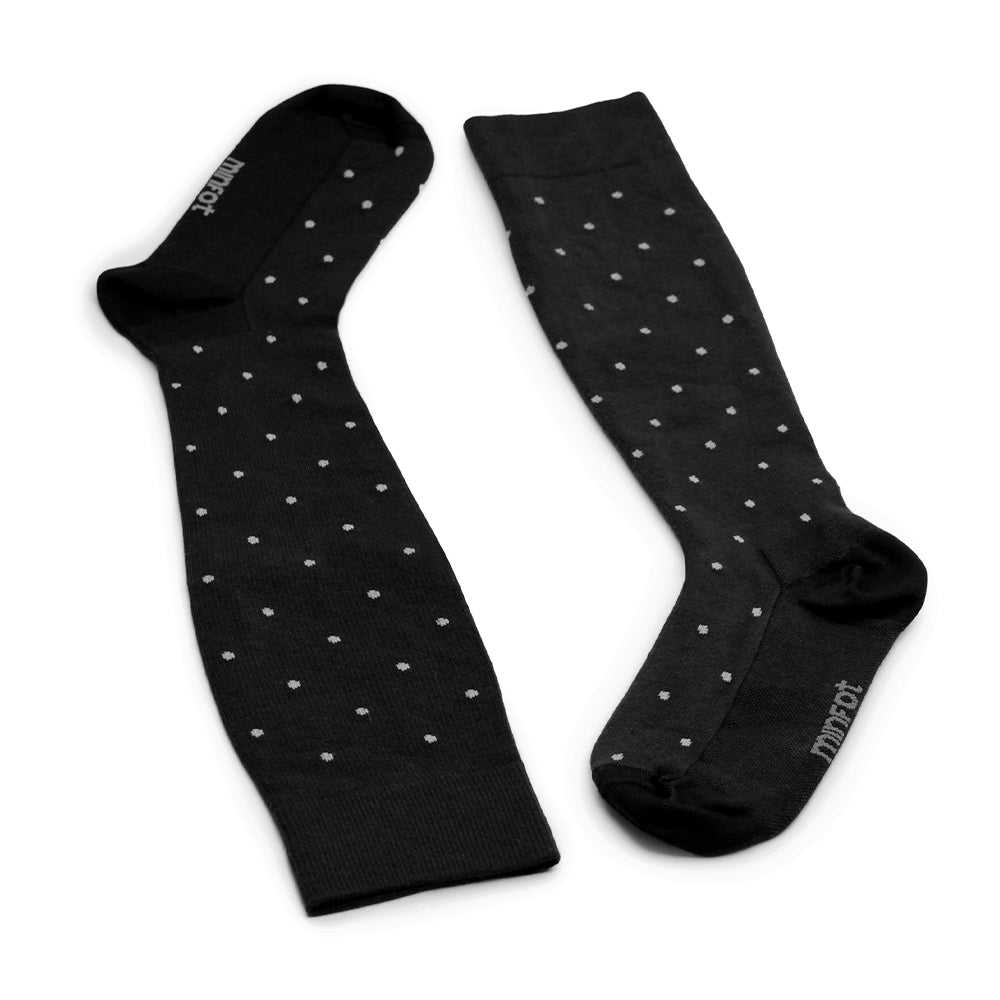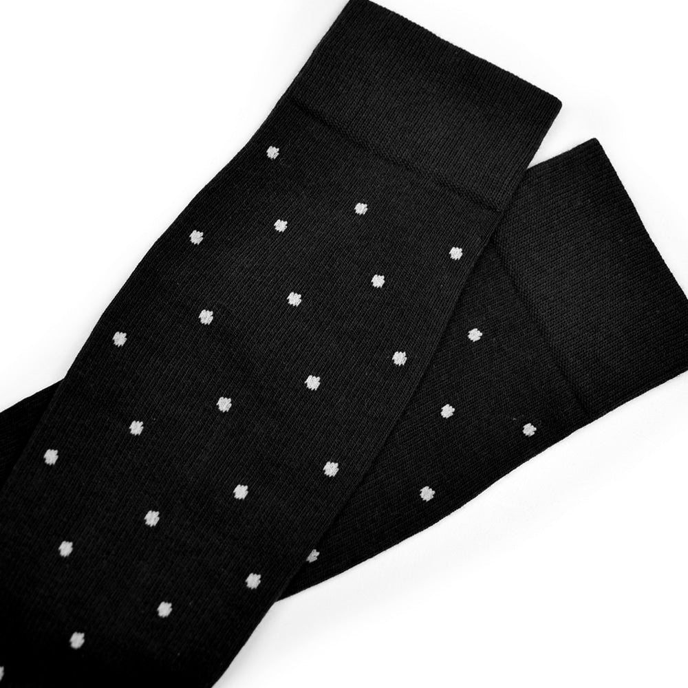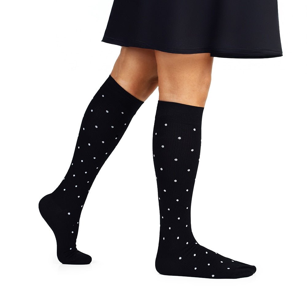Svarta, prickiga stödstrumpor med kompressionsklass 1 (15-21 mmHg) som passar lika bra till vardags, på jobbet, på flygresan eller för finare tillfällen. Strumporna har en klassisk design i svart med vita prickar och är sydda i mjuk bambuviskos som ger en len, lyxig känsla.